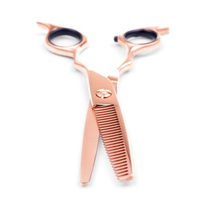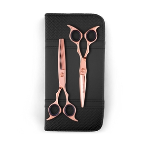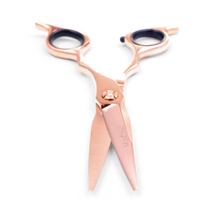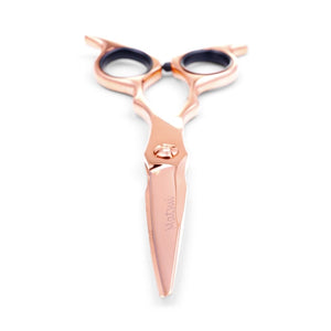 The Matsui Rose Gold Double Threat scissors are thoughtfully designed with ergonomic offset handles that naturally position your thumb for maximum comfort. These handles are crafted to suit most hand shapes and sizes, ensuring that 90% of stylists find them incredibly comfortable to use.