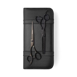 The elegant design of the Matsui Aichei Mountain Matte Black scissors features handles and premium steel that work together to create a lightweight feel, reducing wrist strain and minimizing the risk of RSI or carpal tunnel symptoms. These scissors are precision-engineered with a unique blade angle to ensure hair stays on the tips for smooth, effortless cutting. This design also keeps the blades feeling sharper for longer, making every cut a pleasure.