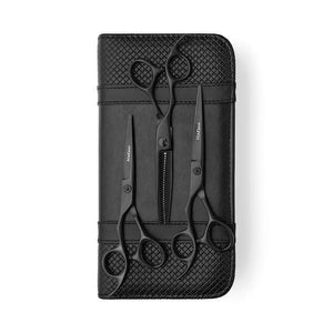 The elegant design of the Matsui Aichei Mountain Matte Black scissors features handles and premium steel that work together to create a lightweight feel, reducing wrist strain and minimizing the risk of RSI or carpal tunnel symptoms. These scissors are precision-engineered with a unique blade angle to ensure hair stays on the tips for smooth, effortless cutting. This design also keeps the blades feeling sharper for longer, making every cut a pleasure.