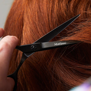 The elegant design of the Matsui Matte Black scissors features handles and premium steel that work together to create a lightweight feel, reducing wrist strain and minimizing the risk of RSI or carpal tunnel symptoms. These scissors are precision-engineered with a unique blade angle to ensure hair stays on the tips for smooth, effortless cutting. This design also keeps the blades feeling sharper for longer, making every cut a pleasure.