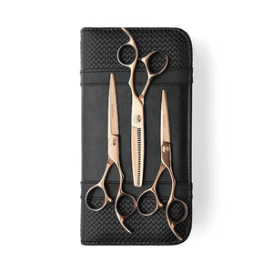 The elegant design of the Matsui VG10 Rose Gold Limited Edition Offset scissors features handles and premium steel that work together to create a lightweight feel, reducing wrist strain and minimizing the risk of RSI or carpal tunnel symptoms. These scissors are precision-engineered with a unique blade angle to ensure hair stays on the tips for smooth, effortless cutting. This design also keeps the blades feeling sharper for longer, making every cut a pleasure.