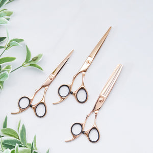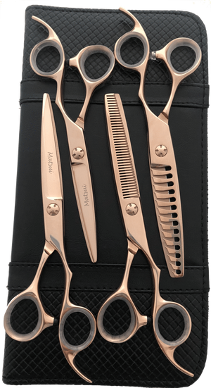 The Matsui Rose Gold Bundle four scissor set is great for the hairdresser who is looking to up their game and refresh their scissor set with some great new scissors custom designed to make your job easier with a great offset handle.
